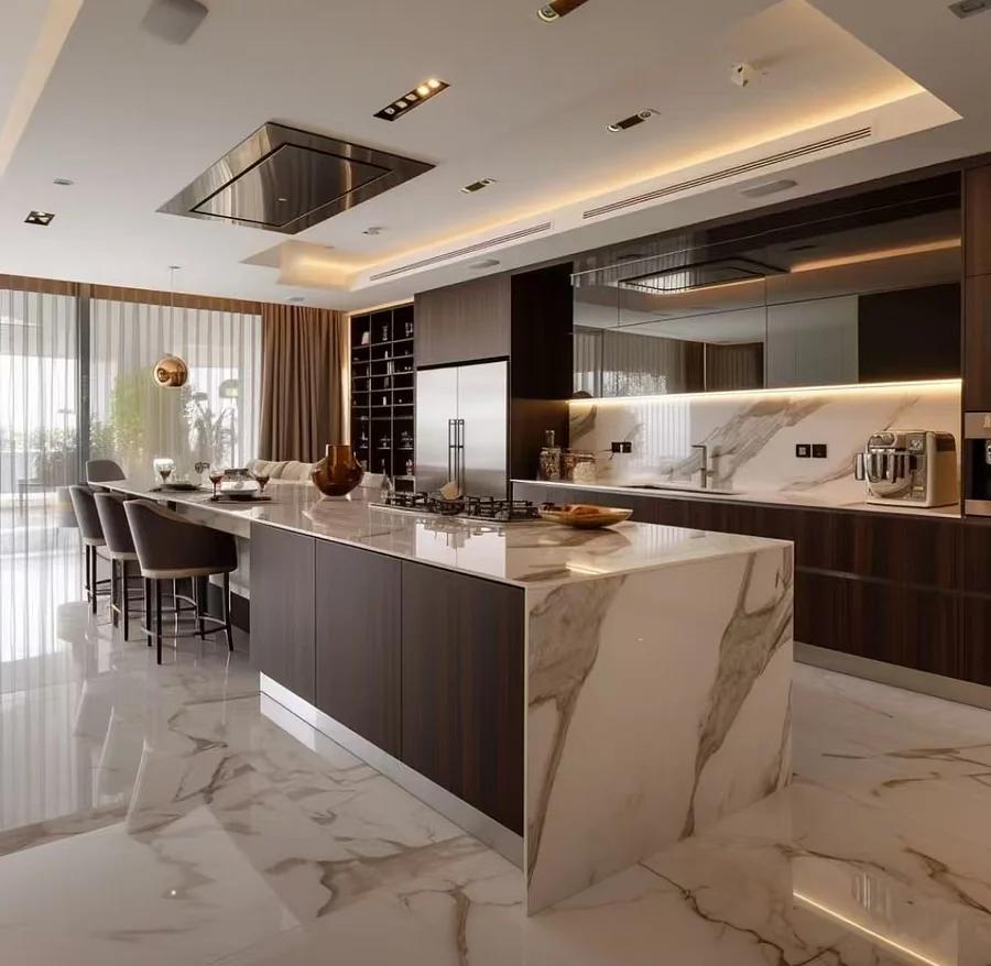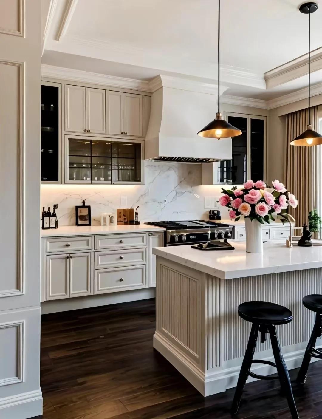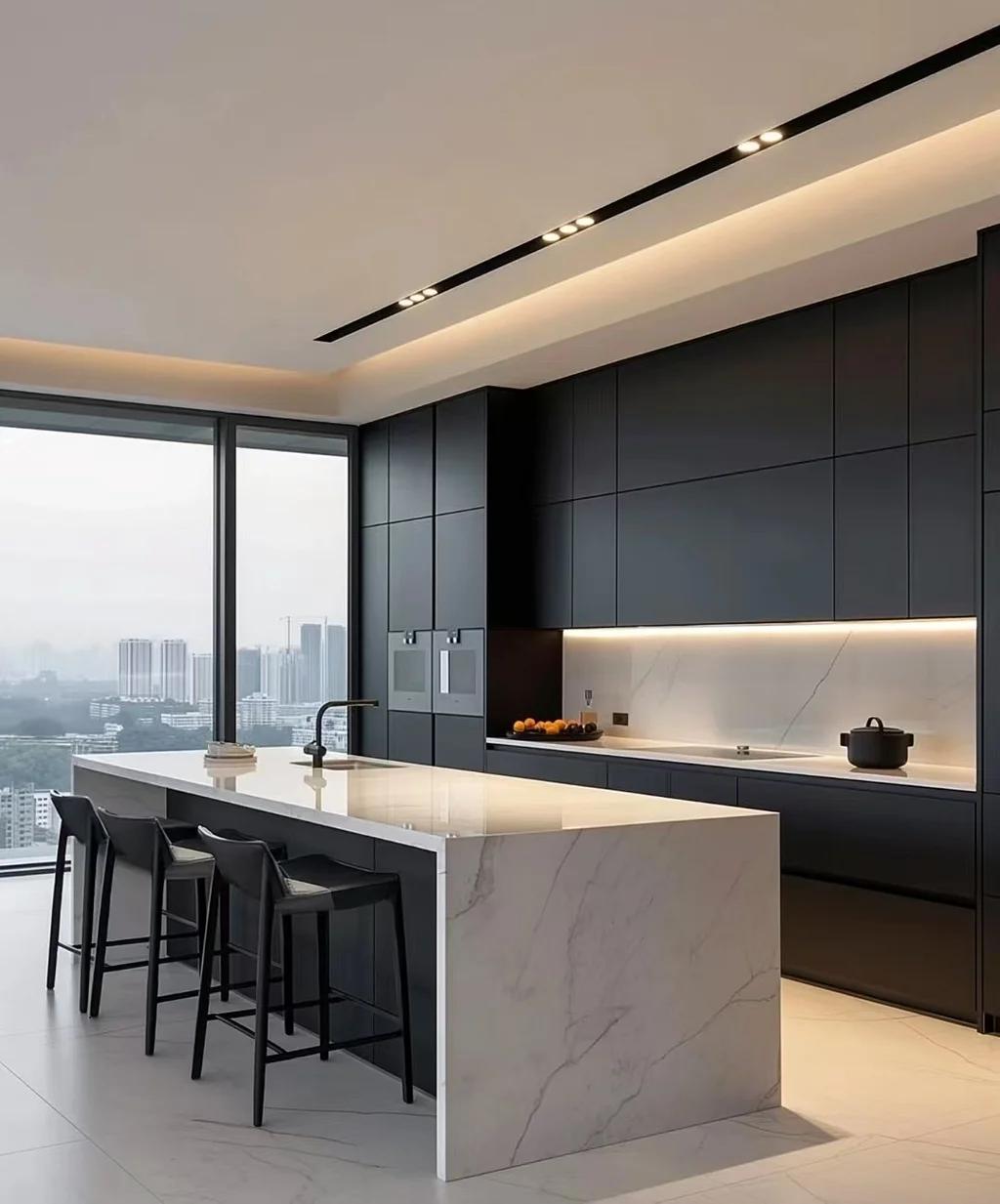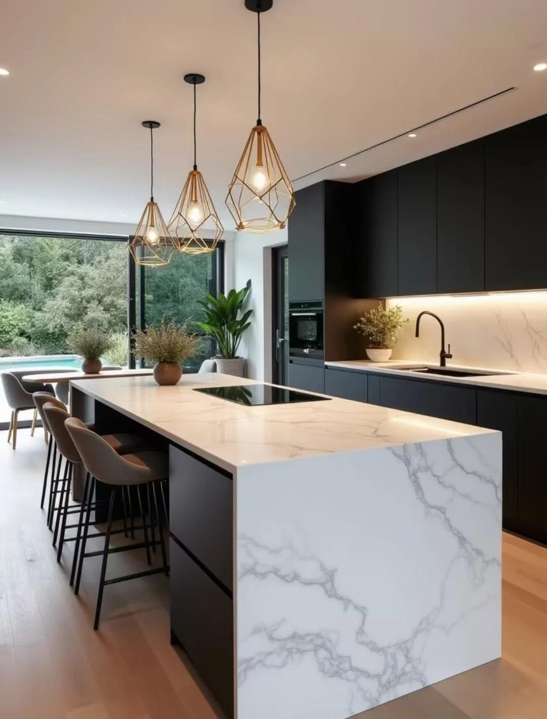 Statement Islands: Waterfall quartz countertops paired with contrasting island cabinetry.