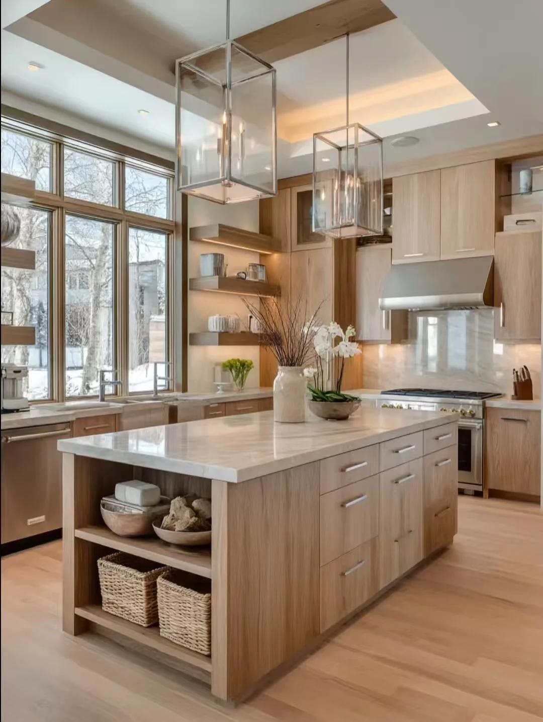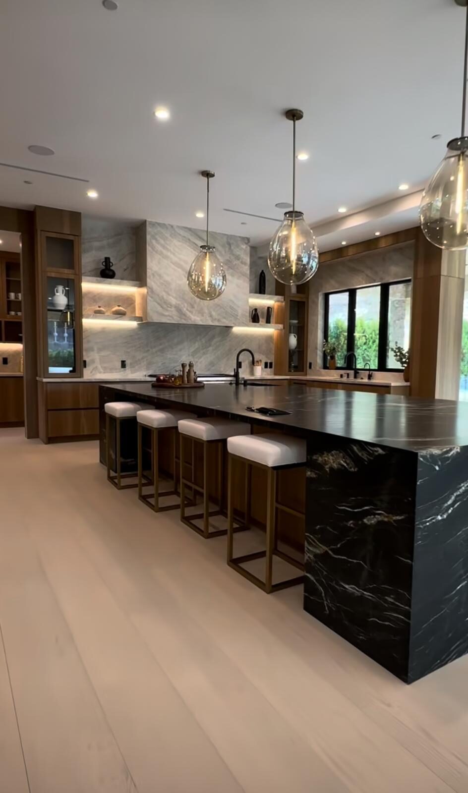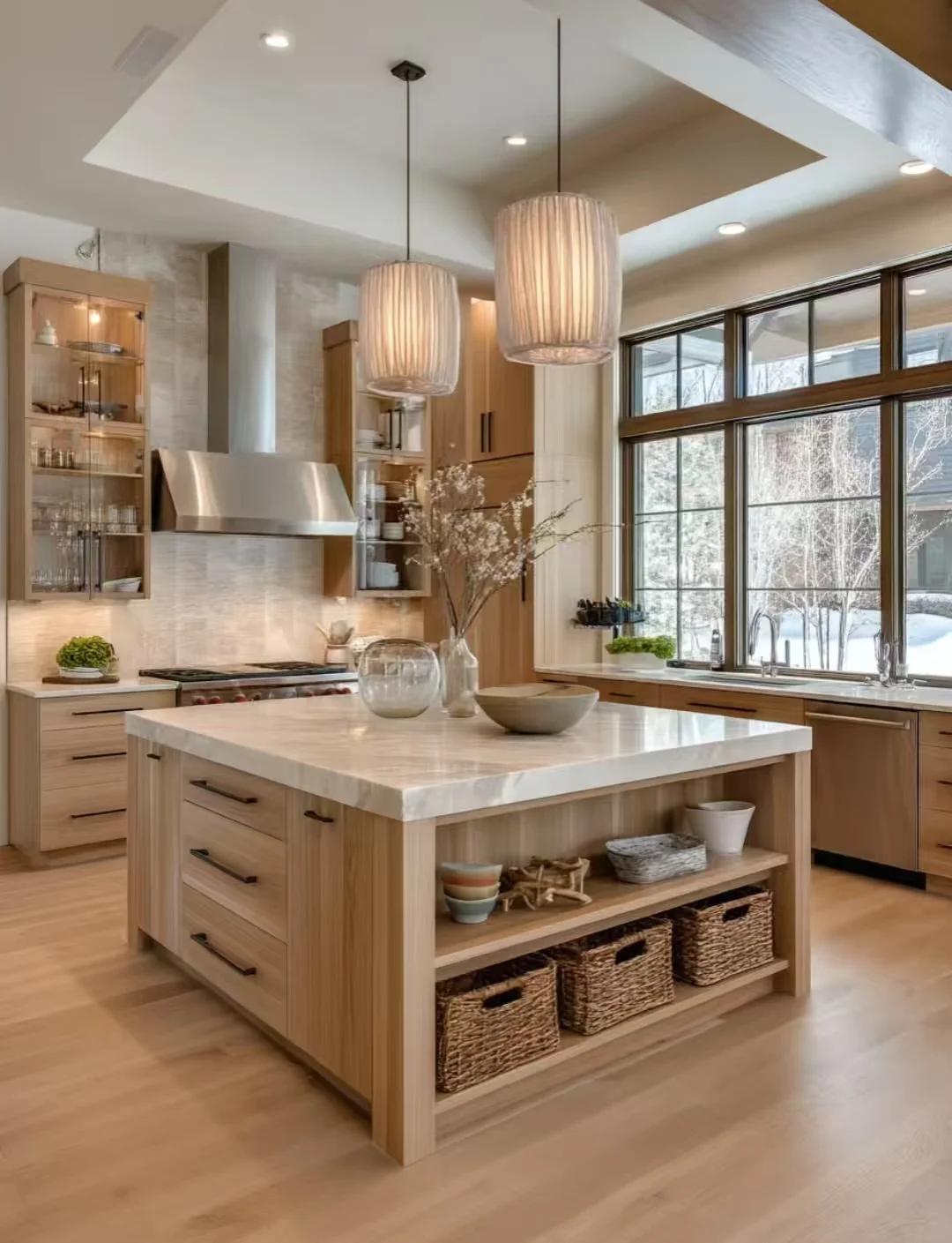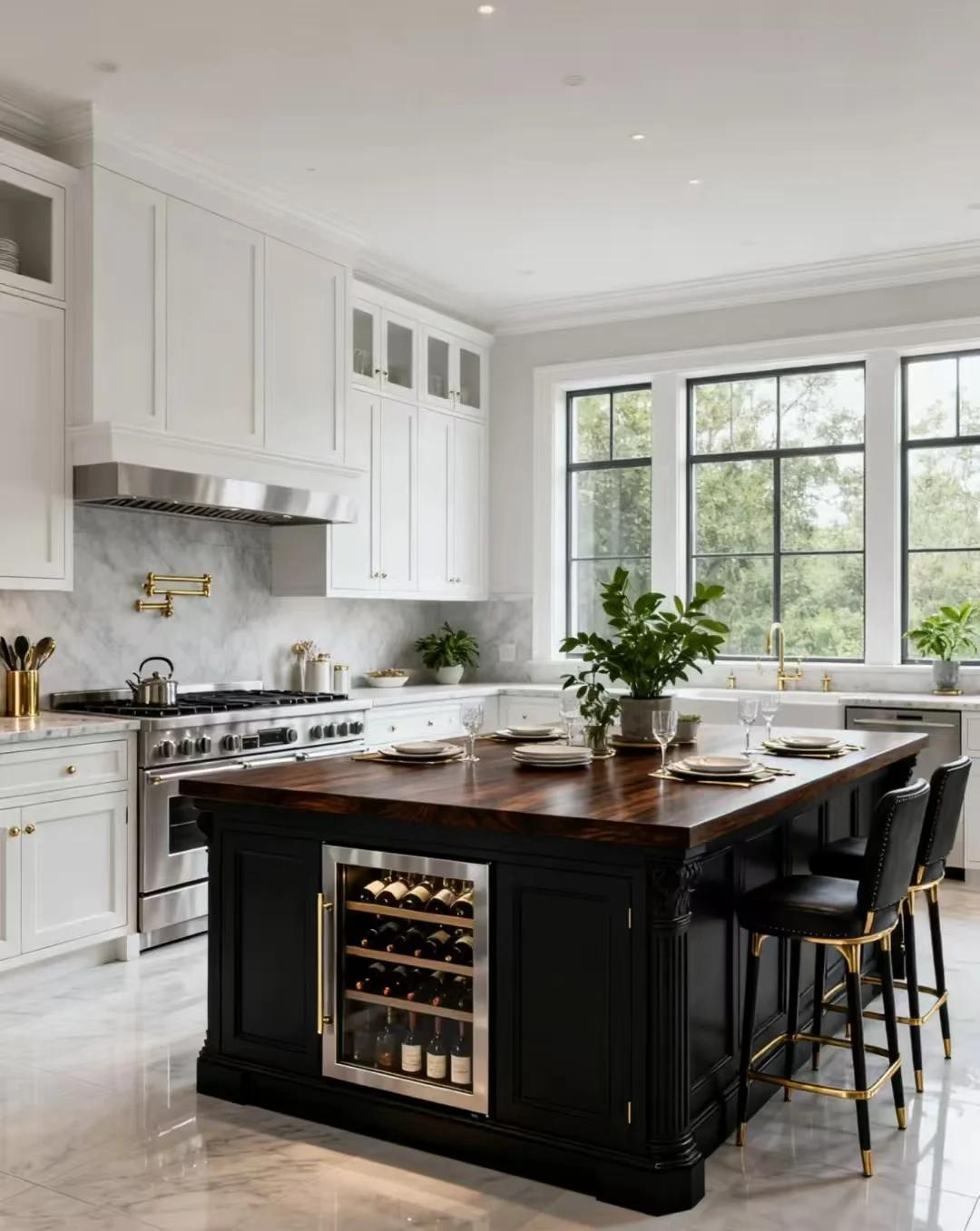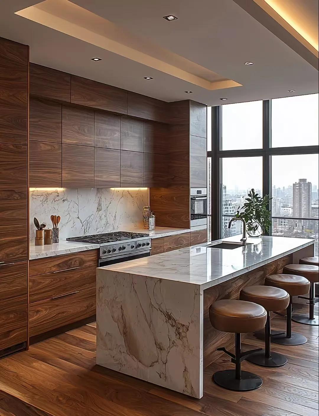 Statement Islands: Waterfall quartz countertops paired with contrasting island cabinetry.
