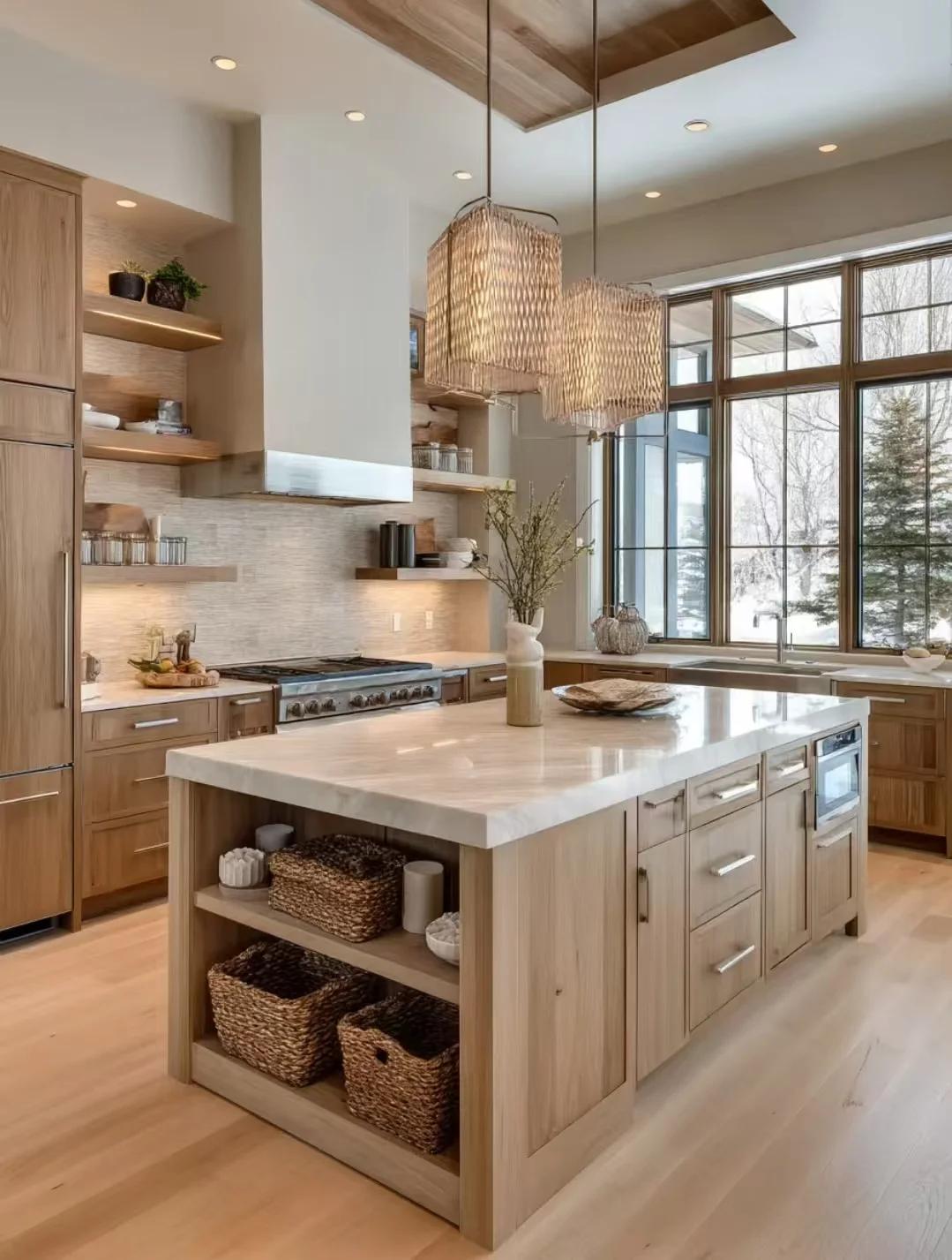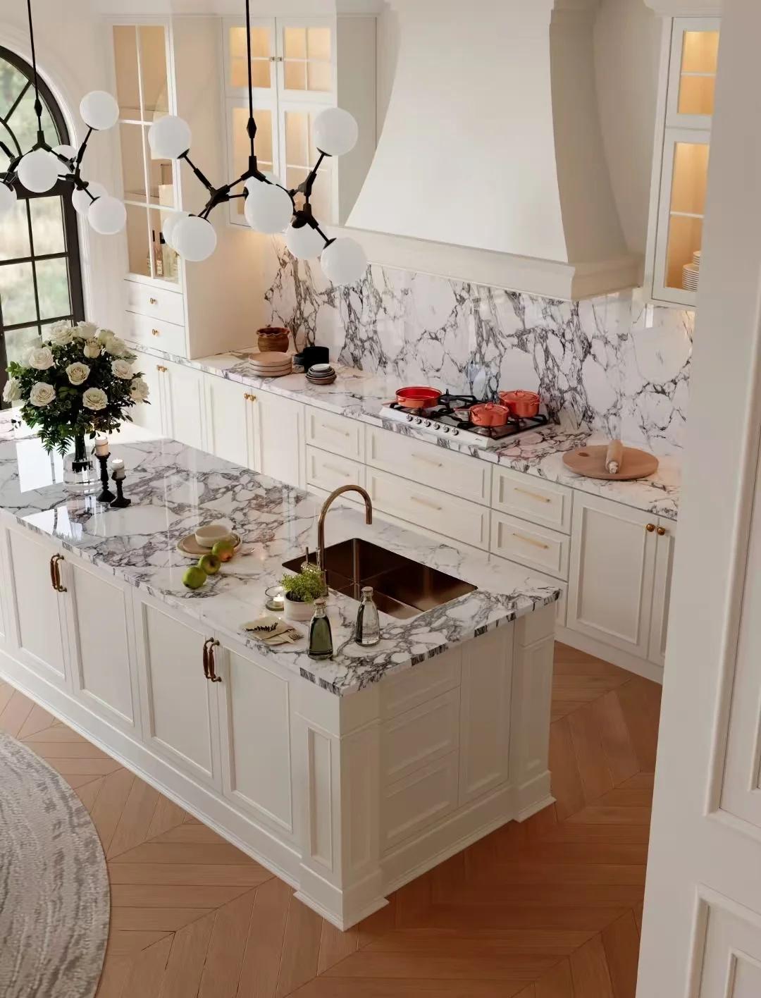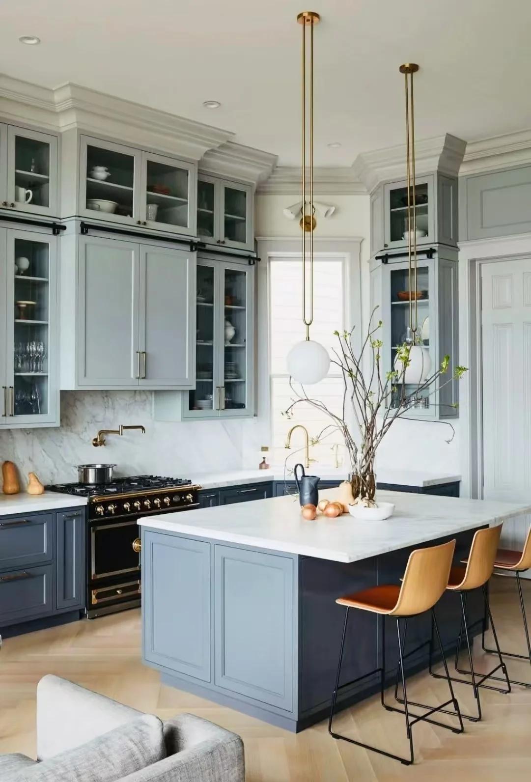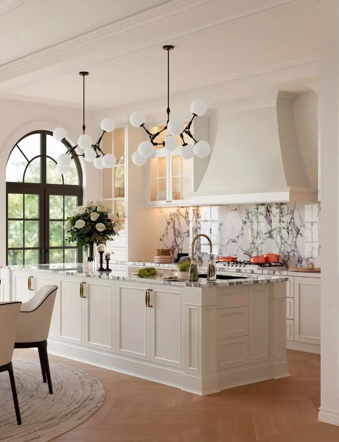 Statement Islands: Waterfall quartz countertops paired with contrasting island cabinetry.