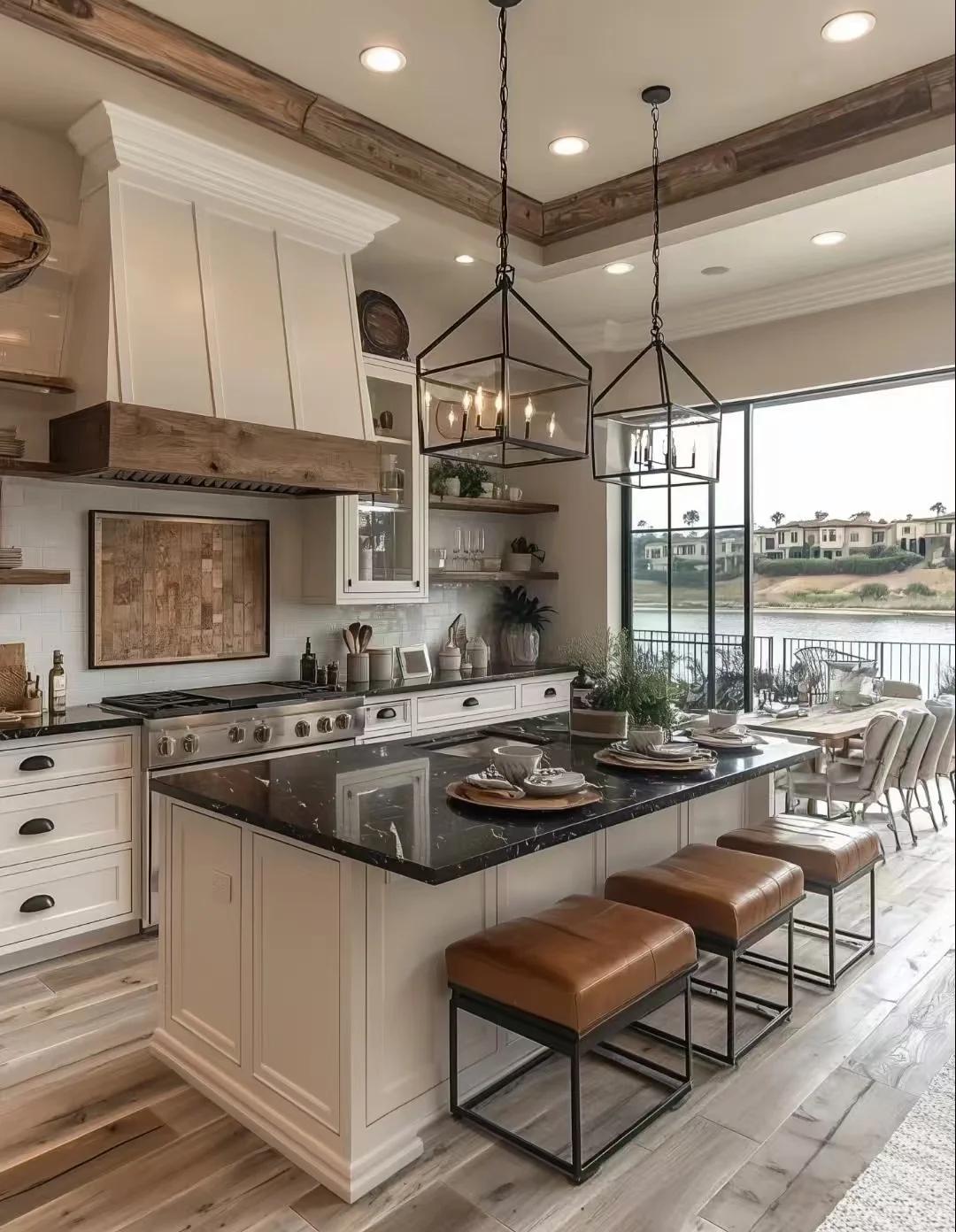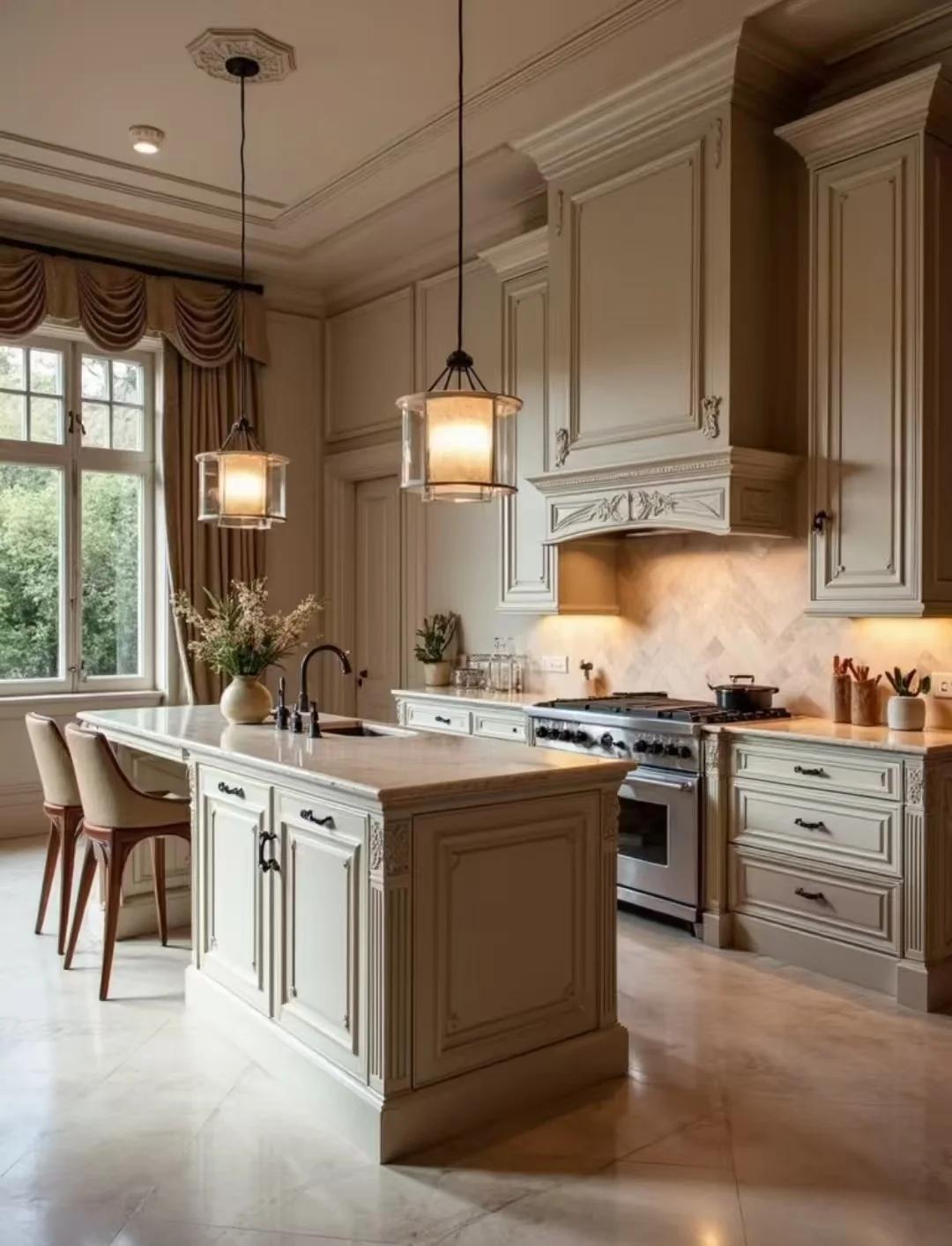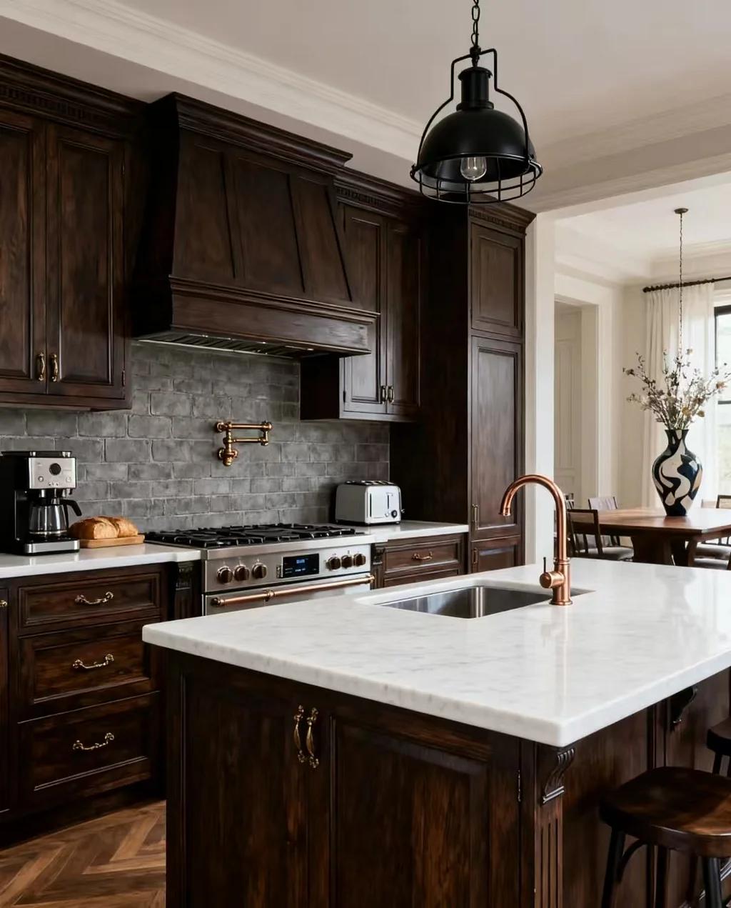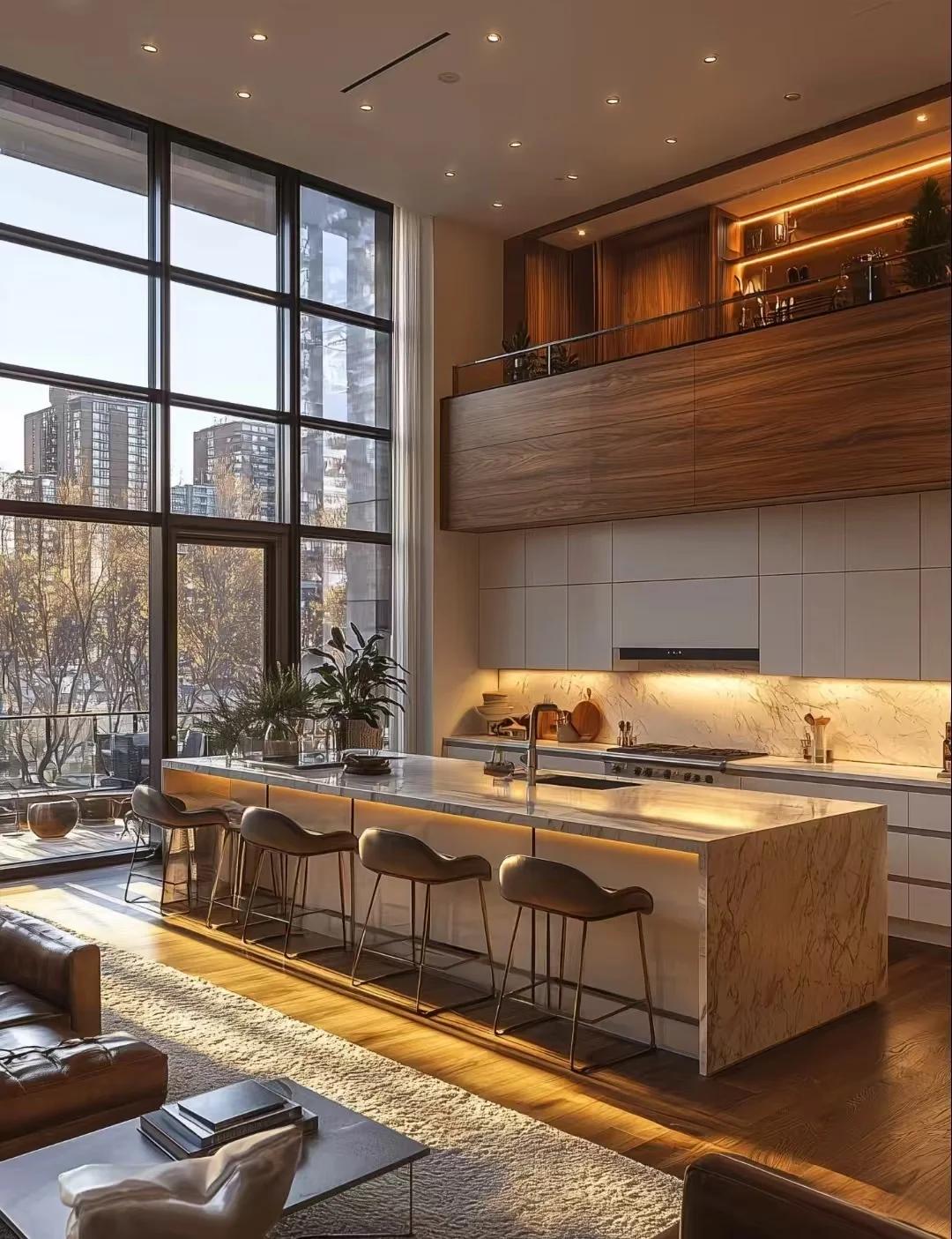 Statement Islands: Waterfall quartz countertops paired with contrasting island cabinetry.